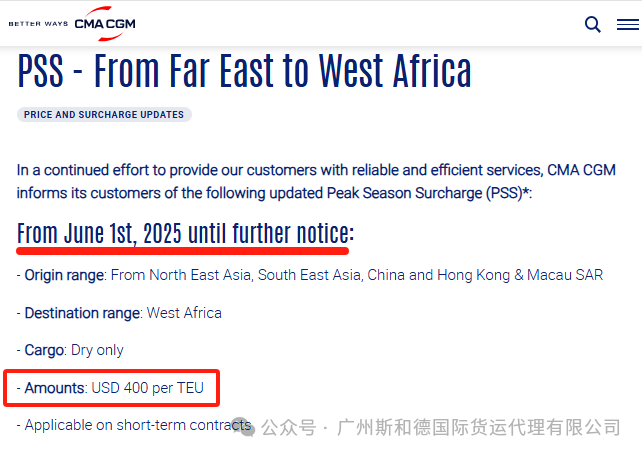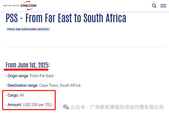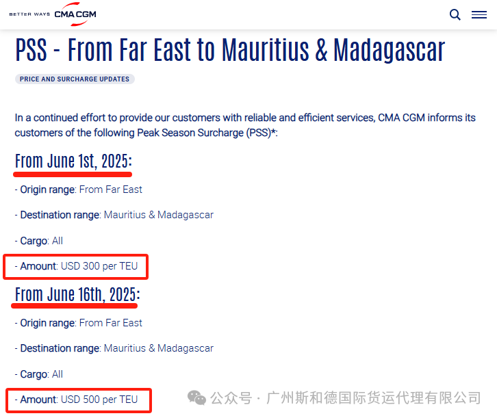 CMA CGM kunngjorde at fra 1. juni 2025 og 16. juni 2025 vil alle laster fra Fjernøsten til Mauritius og Madagaskar være underlagt en henholdsvis høysesong -avgift PSS på henholdsvis USD 300/TEU og USD 500/TEU.