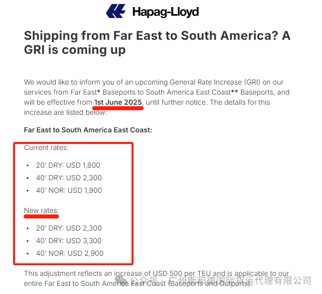 Hapag-Lloyd kunngjorde at den vil øke GRI fra langt øst til Øst-Sør-Amerika fra 1. juni 2025 inntil videre.