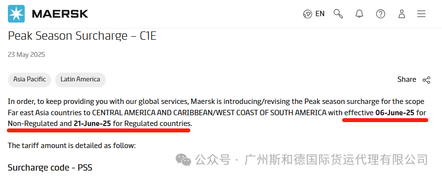 Maersk kunngjorde at fra 6. juni 2025 (Cuba fra 21. juni 2025), vil det pålegge en høytidsutgiftsseske PS fra Fjernøsten til Mellom -Amerika og Karibisk/vestkysten av Sør -Amerika.
