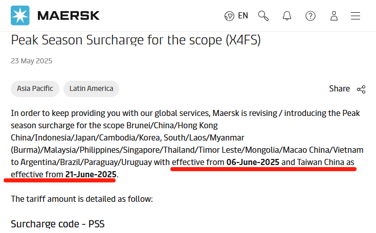 Maersk kunngjorde at fra 6. juni 2025 vil det pålegge en høytidsutgift PSS fra Kina/Hong Kong/Macao til Argentina/Brasil/Paraguay/Uruguay, med en 20 fots tørr beholder på US $ 500 og en 20 fots Refer Container, 40 fot og 40 fot høye kabinett og Reefer-beholder-beholder-beholder.