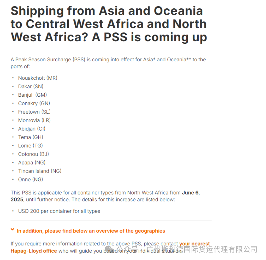 Hapag-Lloyd kunngjorde i dag innføringen av en høytidsutstyr (PSS) på USD 200/TEU fra 6. juni 2025 til havner i Afrika.